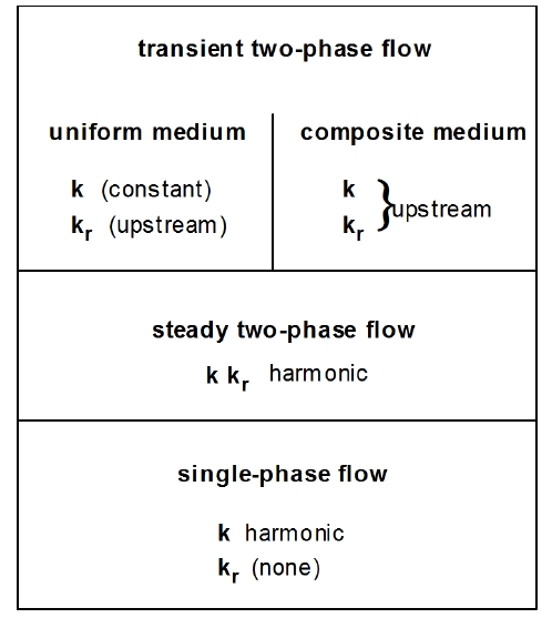 To obtain a reasonably accurate and efficient solution, particularly for multiphase fluid and heat flow problems, a proper interface weighting scheme should be used. It is well known that for single-phase flow, the appropriate interface weighting scheme for absolute permeability is harmonic weighting. For two-phase flow, the added problem of relative permeability weighting arises. It has been established that for transient flow problems in homogeneous media, relative permeability must be upstream weighted, or else phase fronts may be propagated with erroneous speed (Aziz and Settari, 1979). Studies at the Lawrence Berkeley National Laboratory have shown that for transient two-phase problems in composite (layered) media, both absolute and relative permeability must be fully upstream weighted to avoid the possibility of gross errors (Tsang and Pruess, 1990; Wu et al., 1993). The applicable weighting schemes for different flow problems are summarized in Figure 8. There is no single weighting scheme for general two-phase flows in composite media that would at the same time preserve optimal accuracy for single-phase or steady two-phase flows.