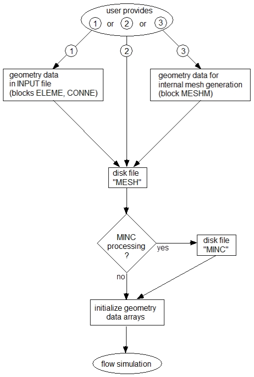 In TOUGH4, volume elements are identified by names that consist of a string of by default five characters, unless a different length of element names is specified in data record MODDE.2. The names are arbitrary. Flow connections are specified as ordered pairs of elements, such as “(ELE10, ELEll)”. A variety of options and facilities are available for entering and processing geometric data (see Figure 27). Element volumes and domain identification can be provided by means of a data block ELEME in the input file, while a data block CONNE can be used to supply connection data, including interface area, nodal distances from the interface, and orientation of the nodal connection line relative to the vertical. These data are internally written to a file MESH, which in turn initializes the geometry data arrays used during the flow simulation. It is also possible to omit the ELEME and CONNE data blocks from the main input file, and provide geometry data directly on a file MESH.