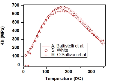 The Henry’s law coefficient for dissolution of CO2 in water is strongly dependent on temperature. The correlation used in the previous release of EOS2 had been developed by O’Sullivan et al. (1985) for the elevated temperature conditions encountered in geothermal reservoirs. It is accurate to within a few percent of experimental data in the temperature range of 40 ˚C ≤ T ≤ 330 ˚C, but becomes rather inaccurate at lower temperatures and even goes to negative values for T < 30 ˚C (see Figure 15). Since TOUGH3, the Henry’s law coefficient calculation was updated with the correlation developed by Battistelli et al. (1997), which is accurate for 0 ˚C ≤ T ≤ 350 ˚C. The Battistelli et al. formulation agrees well with another correlation that was developed by S. White (1996, private communication).