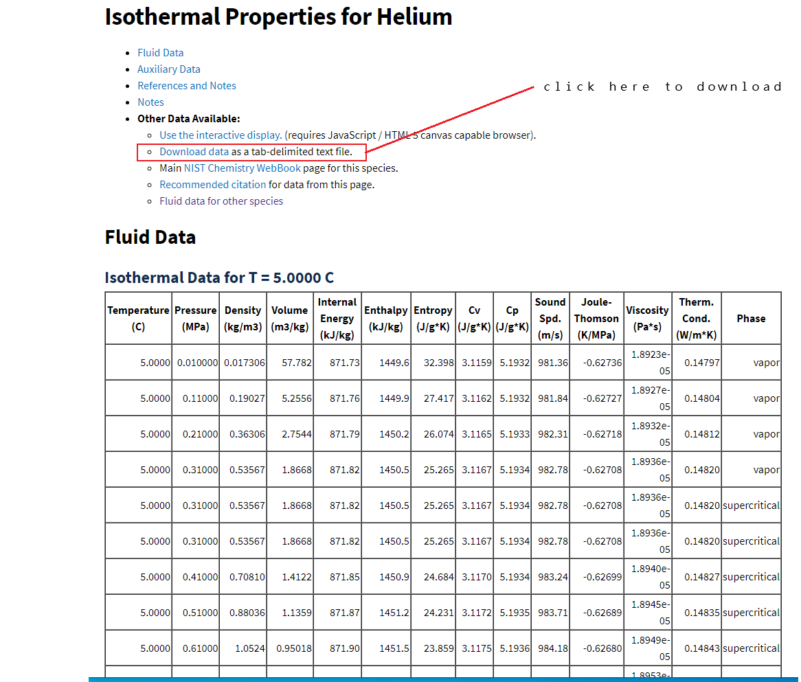 Gas properties from other sources are also allowed. It is required to include at least the 5 essential columns (temperature, pressure, density, enthalpy, viscosity). The data file must use the same headers and units as the downloaded NIST data file and all data are separated by spaces.