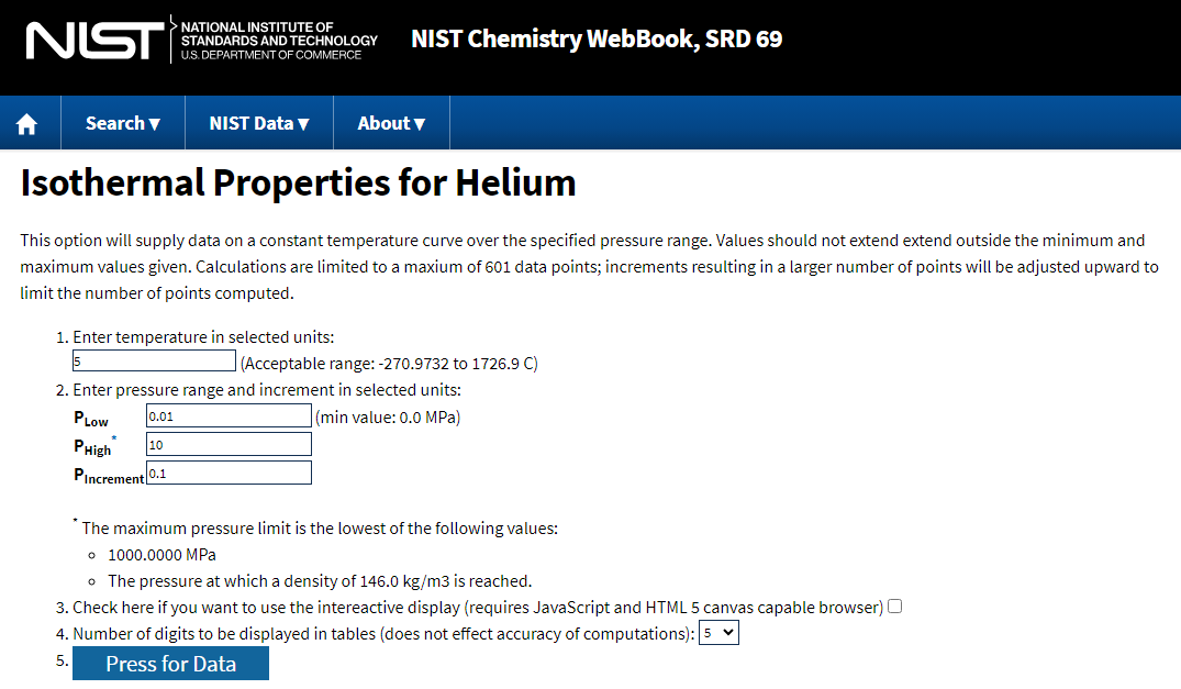(5). Repeat step (3) and (4) to download the data file for different temperatures, e.g. for temperature=8, 11, 14, ...., 150 oC, get files 8.dat, 11.dat, 14.dat, ......, 150.dat. The increment of temperature can be different. Combine the downloaded files into a single file "gas_properties.dat" in the sequence of increasing temperature. The first two lines (headers and units) in the downloaded files can be deleted except the first file.