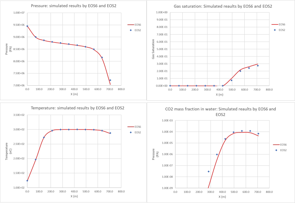 This example models the system as a fractured medium with embedded impermeable matrix blocks in the shape of cubes. The matrix blocks were assigned a non-vanishing porosity of , so that they will contain a small amount of water. This has no noticeable impact on fluid and heat flows, and is done to prevent the water mass balance equation from degenerating into the singular form 0 = 0. Running the problem with in the matrix blocks (domain MATRX) is also possible, but this results in more sluggish convergence and considerably smaller time steps. The MESHMaker module is used to perform MINC-partitioning of the primary grid (partition type THRED with three equal fracture spacings). The first MINC continuum, corresponding to the fracture domain, occupies a volume fraction of 0.02 and has an intrinsic porosity of 50 %, for an effective fracture porosity of 1 %. By inserting an ENDCY record in front of the MESHM data block, the MINC process can be disabled and the problem can be run as an effective porous medium. A CO2 partial pressure of 5 bars is specified. Figure 10-n3 shows the comparison of the simulation results with EOS6 and EOS2..